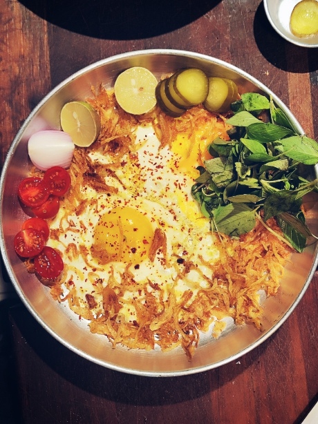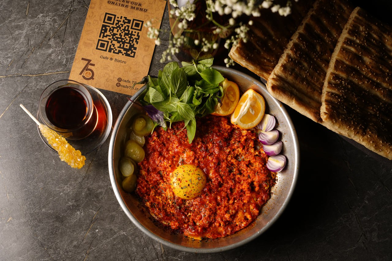 گوجه حلقه شده سرخ شده با کره به همراه رب و پیازچه و دو عدد تخم مرغ و ادویه مخصوص به همراه دورچین کامل