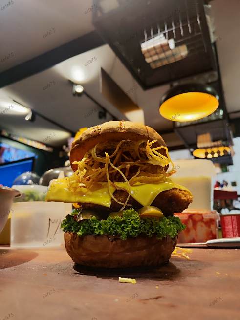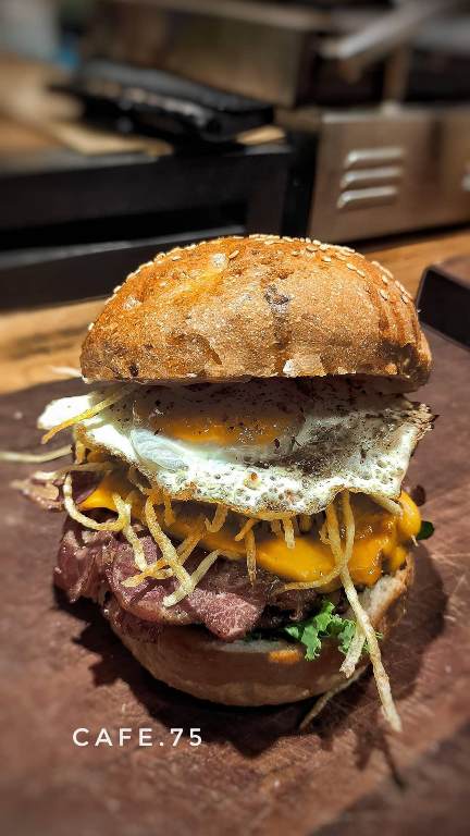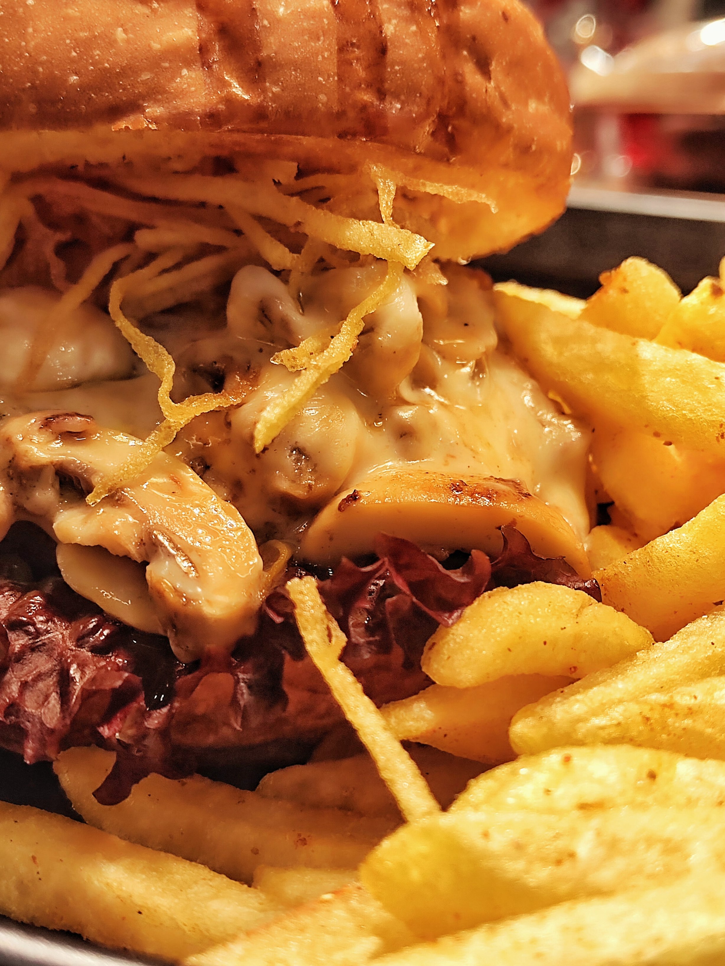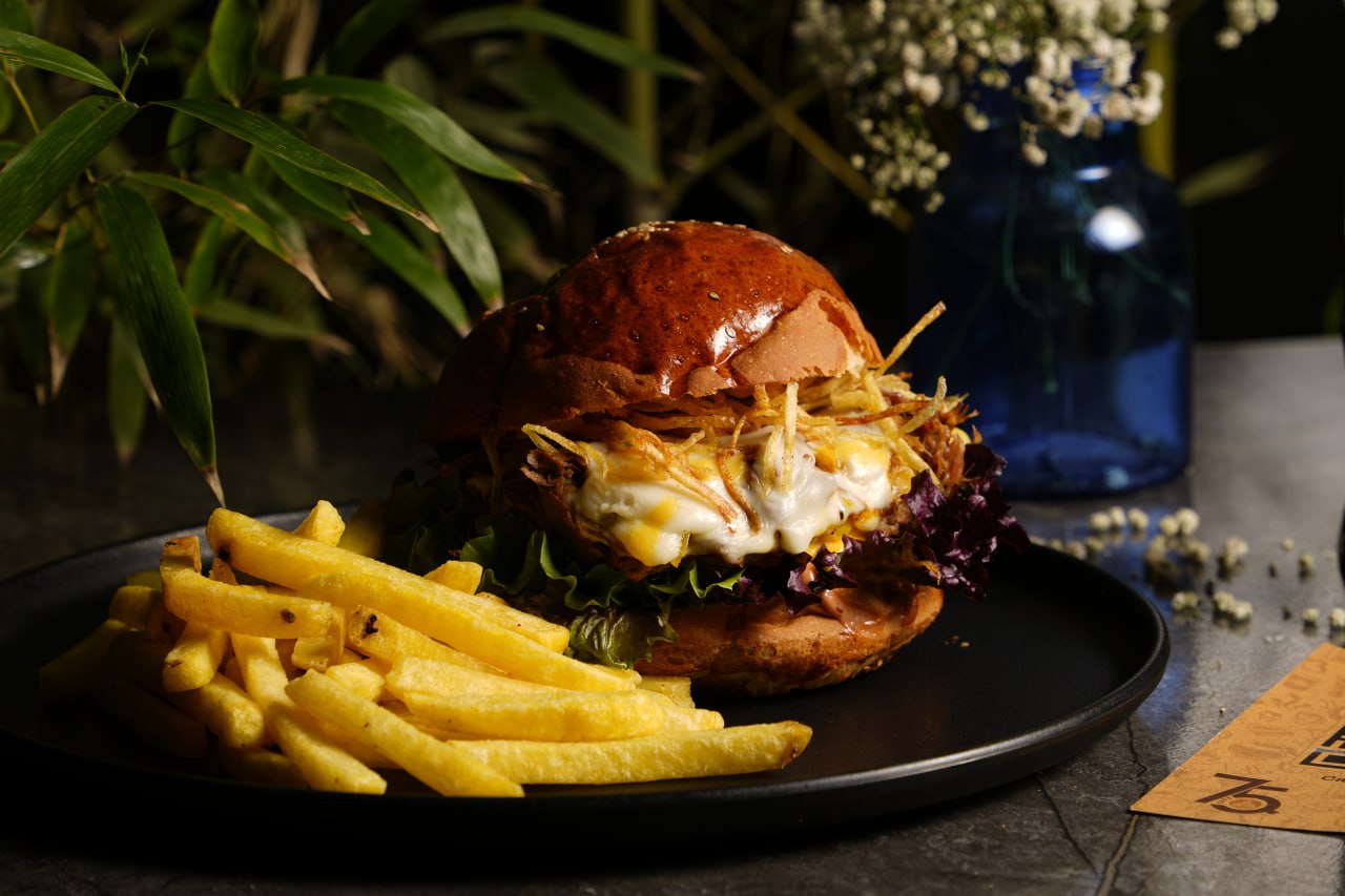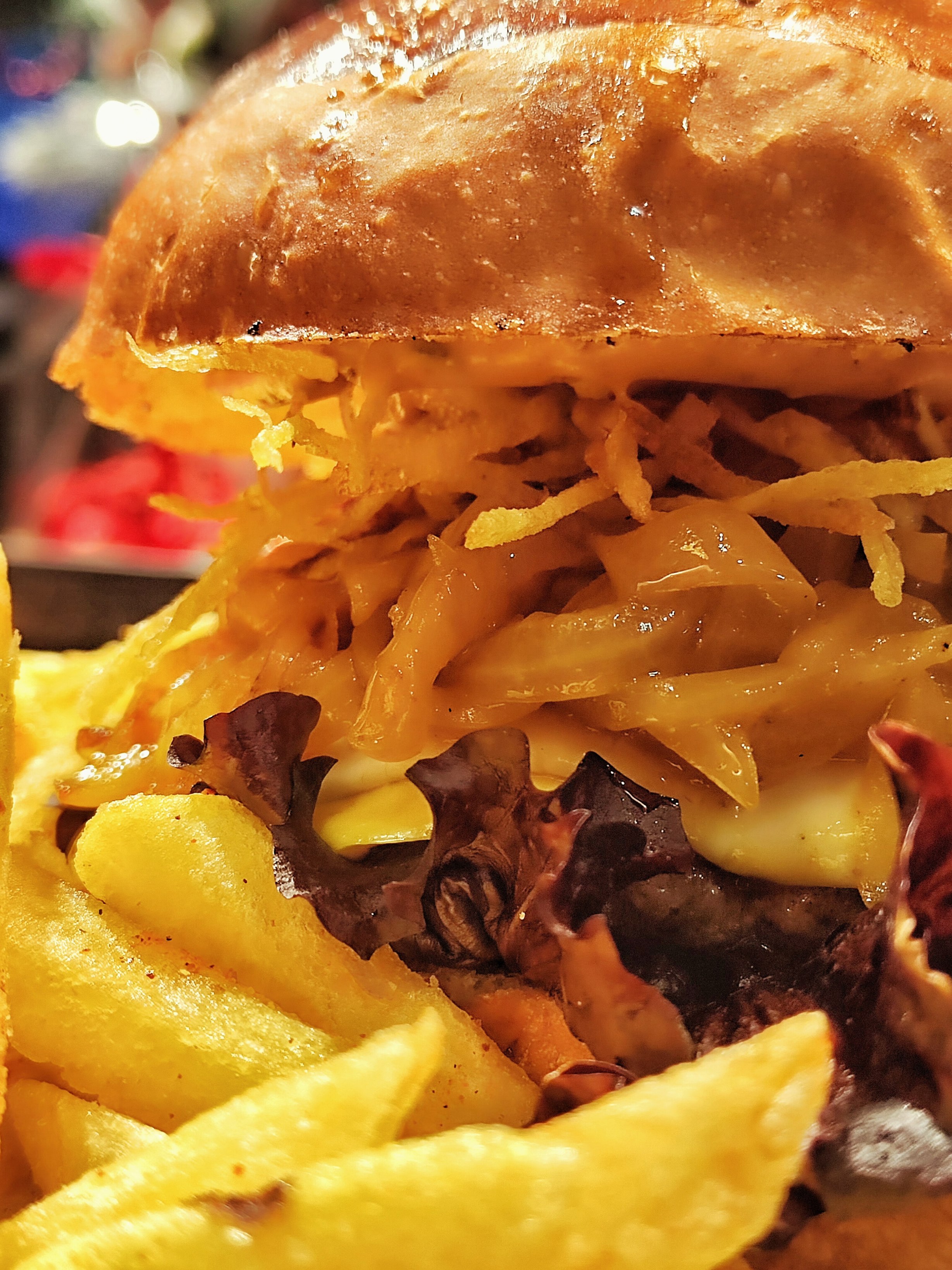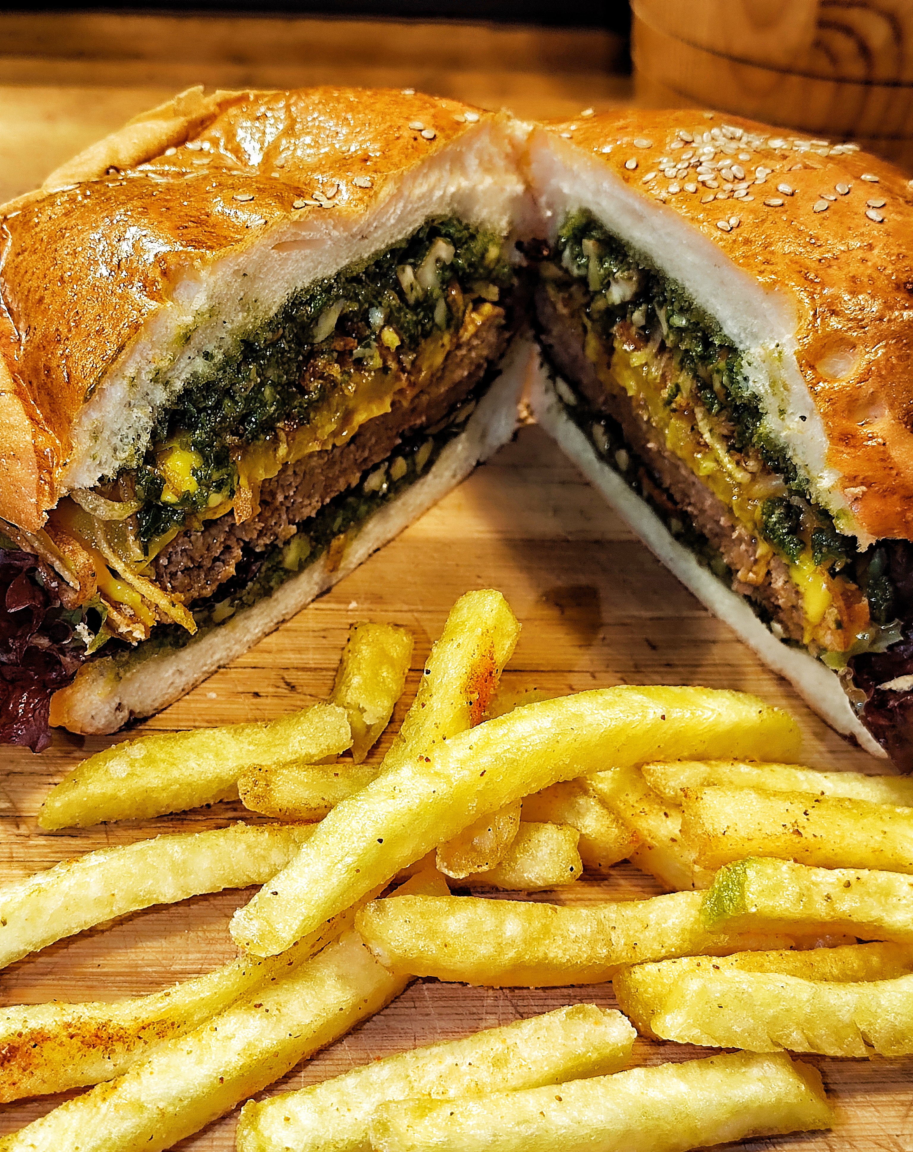 180 گرم برگر دست ساز+150 گرم رست بیف+ پیازکاراملی+2 عدد پنیر گودا+ سیب زمینی سرخ شده