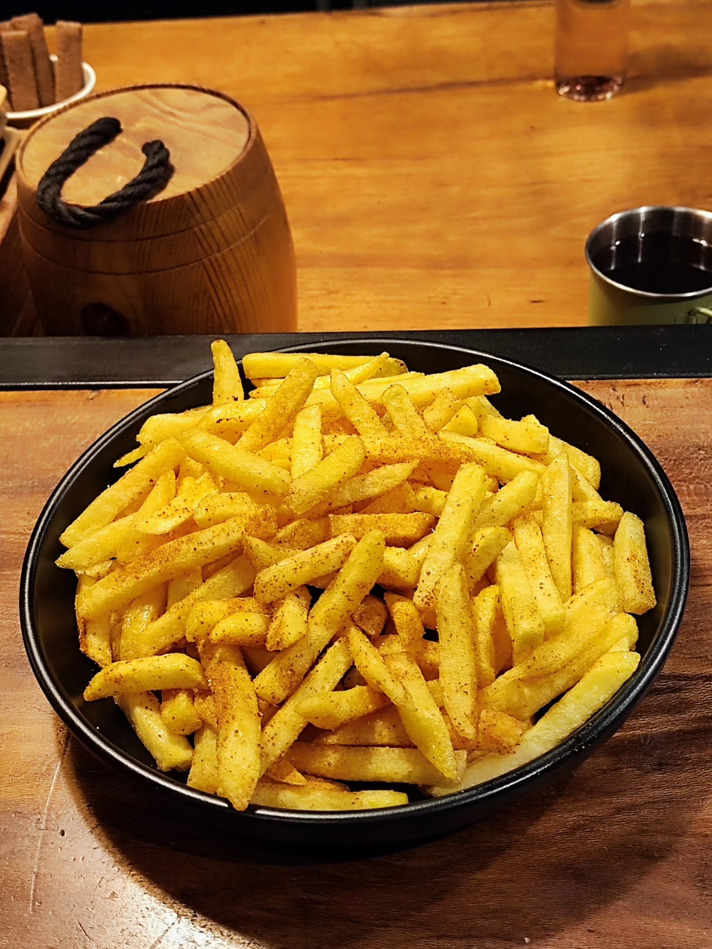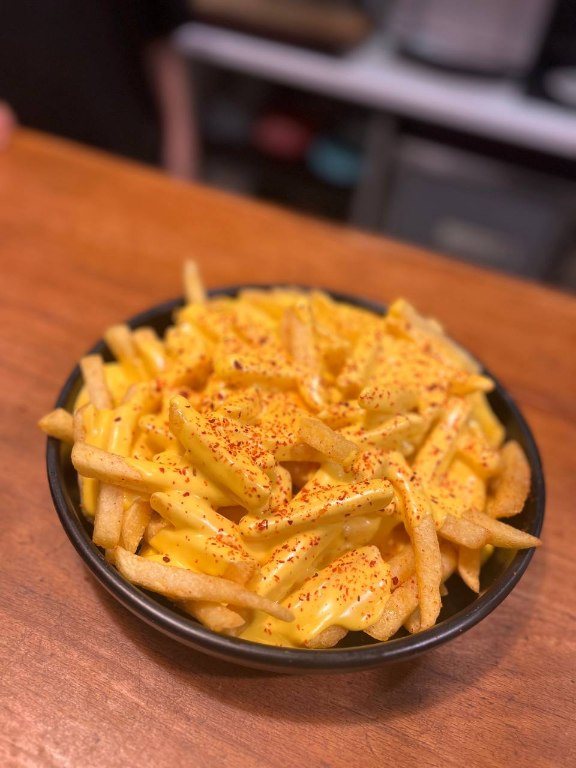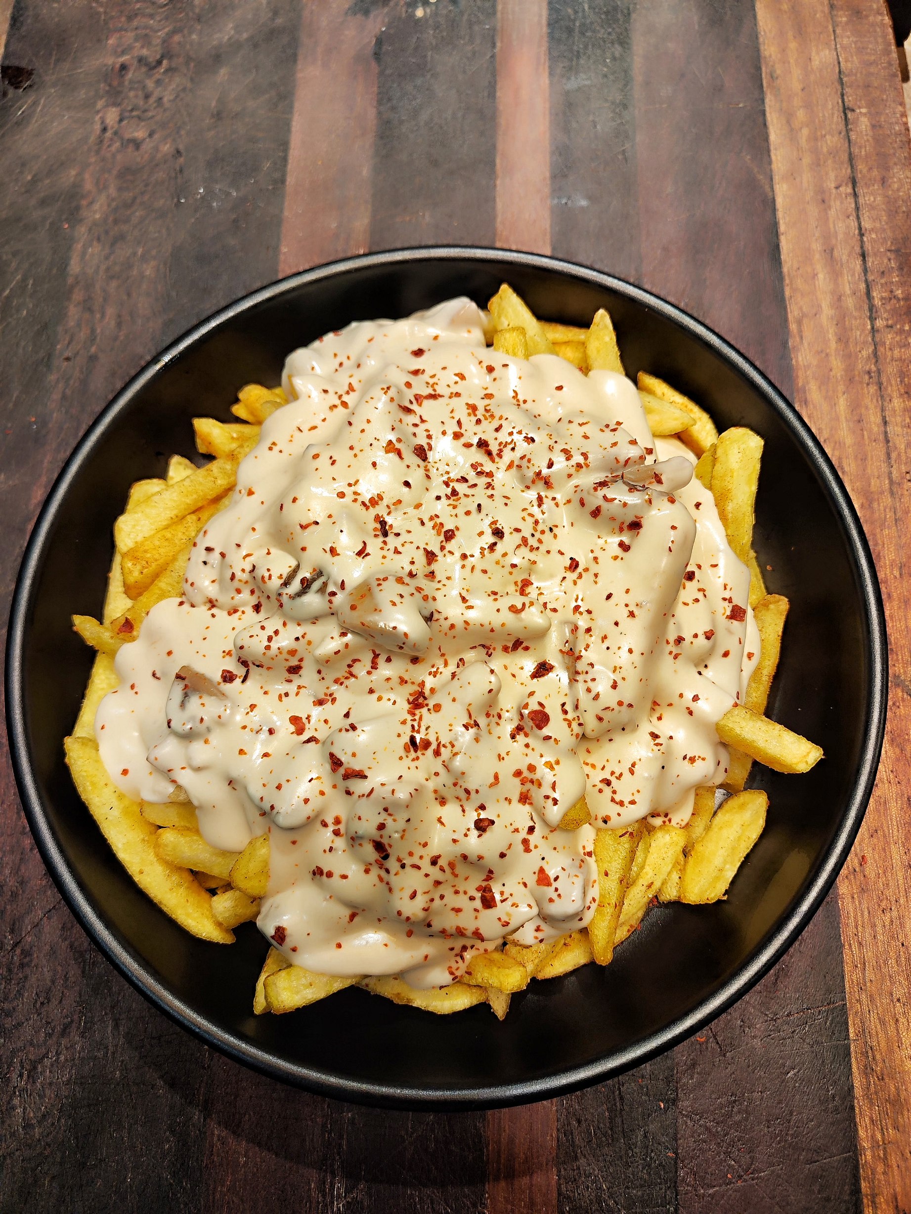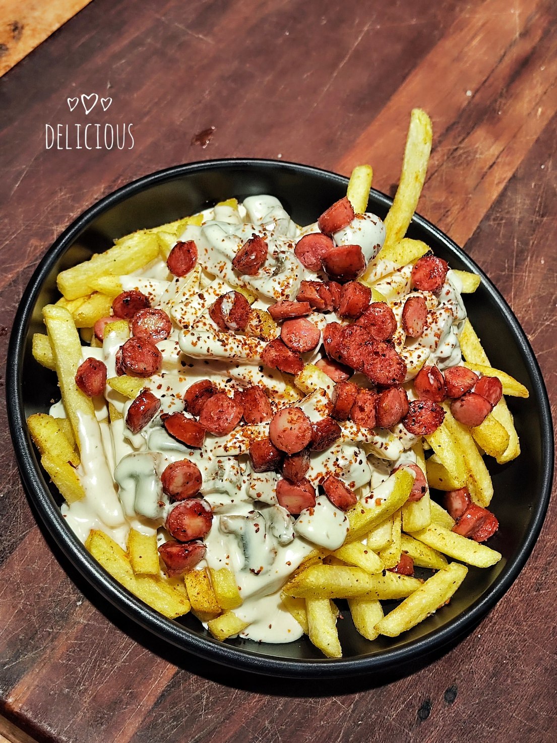 سیب زمینی سرخ کرده به همراه سس آلفردو با پنیر پروسس و سوسیس چوریتسو