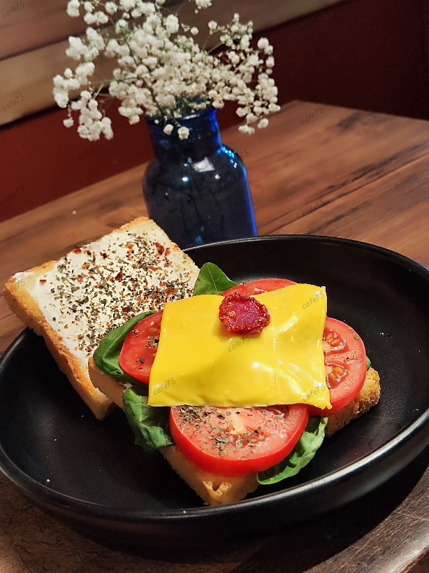 نون تست شده با کره به همراه پنیر خامه ای ریحون ایتالیایی گوجه فرنگی و پنیر ورقه ای گودا