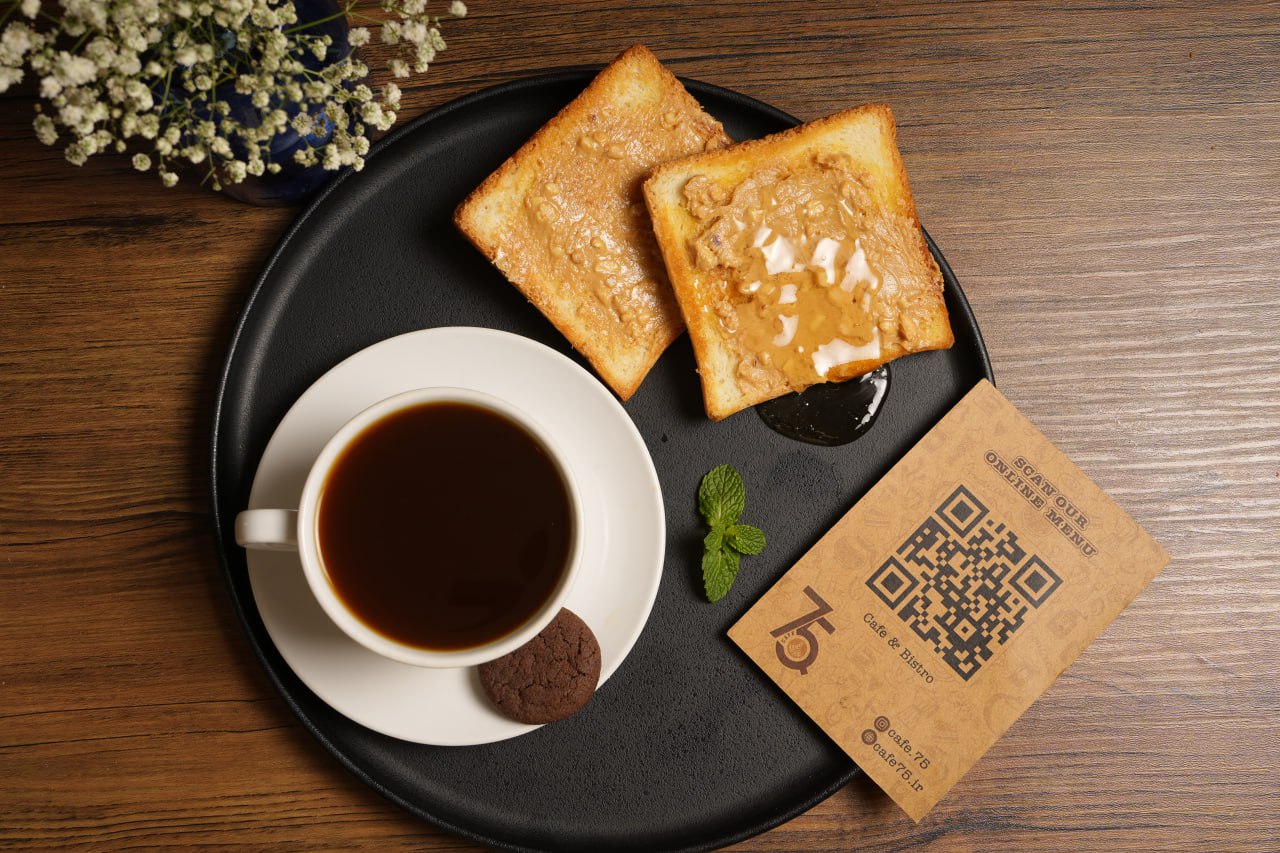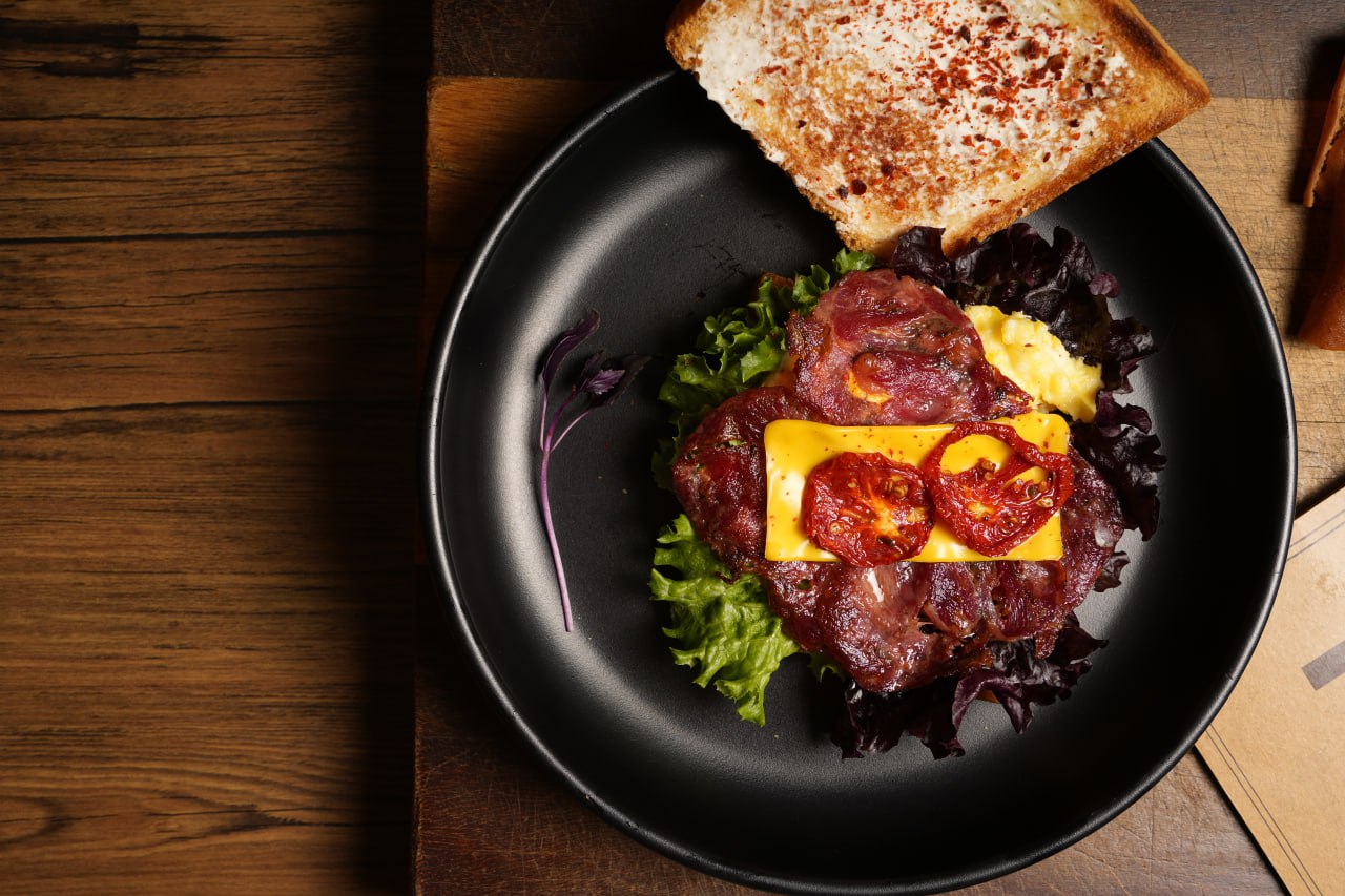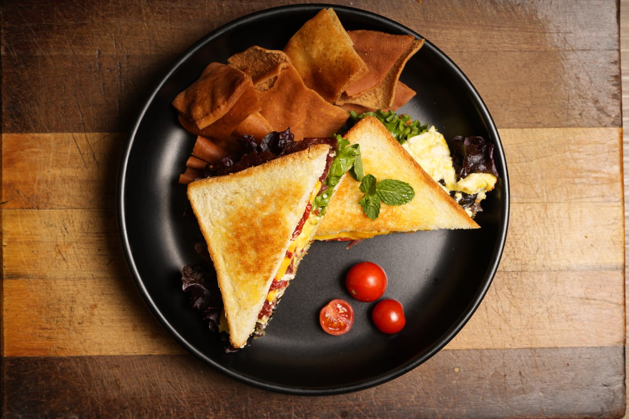 نان تست شده با کره به همراه اسکرامبل تخم مرغ به همراه بیکن گوساله و پنیر گودا و دورچین نان پیتا