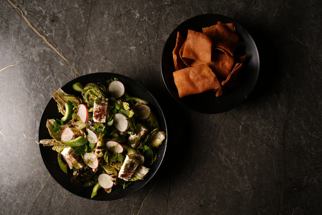 کاهو لیتل جم به همراه سس فتوش پنیر و خیار ترب اسلایس شده و جعفری به همراه ادویه مخصوص