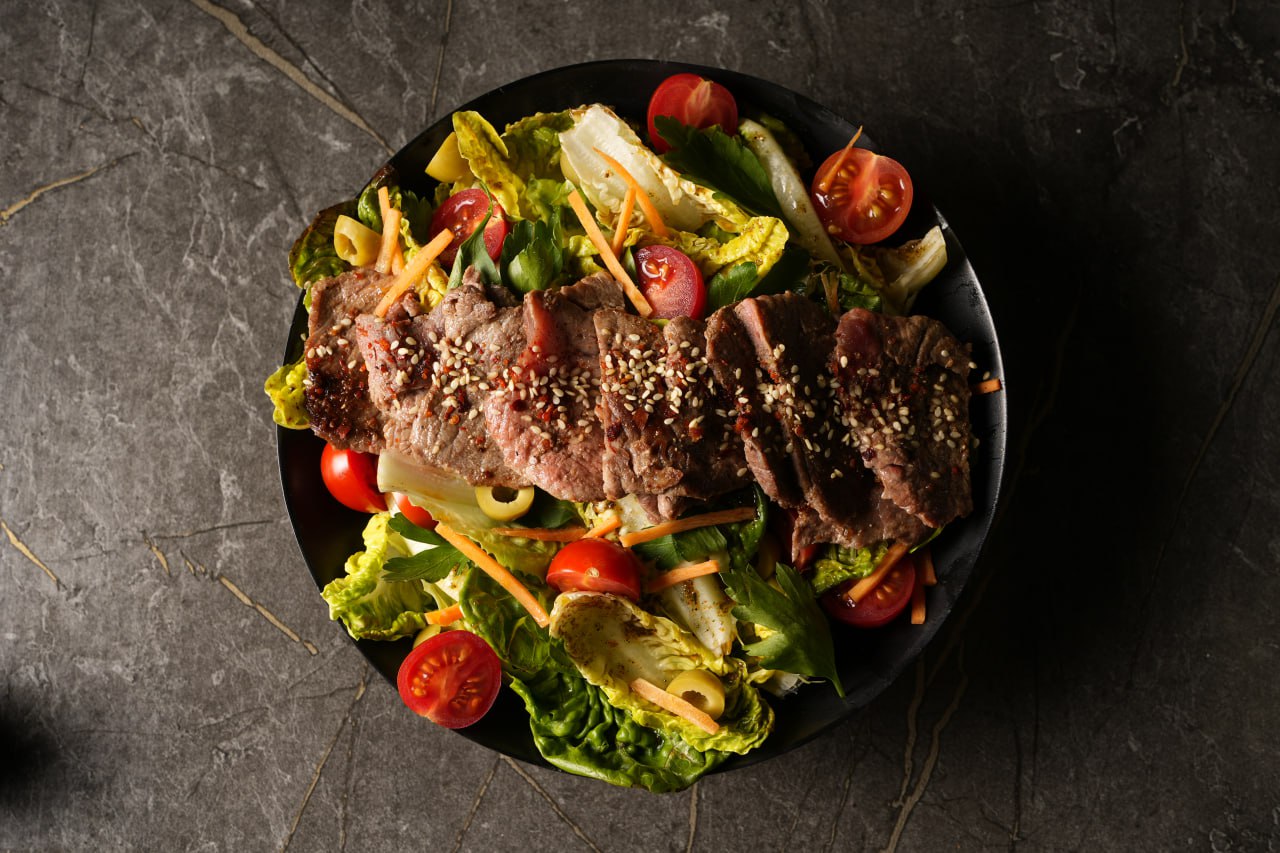 سس مخصوص اسیای ۱۵۰ گرم گوشت رست شده کاهو لیتل جم گوجه گیلاسی لیتل جم و جعفری پیاز چه