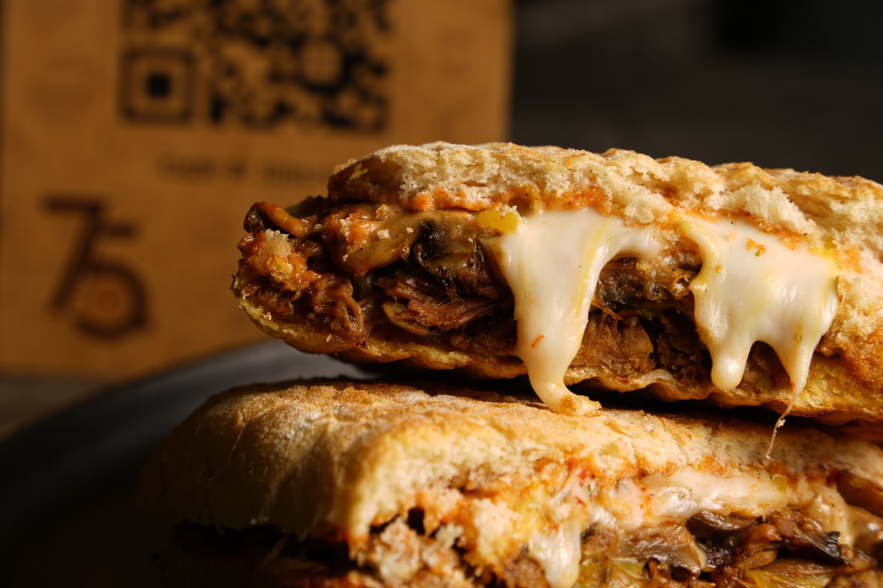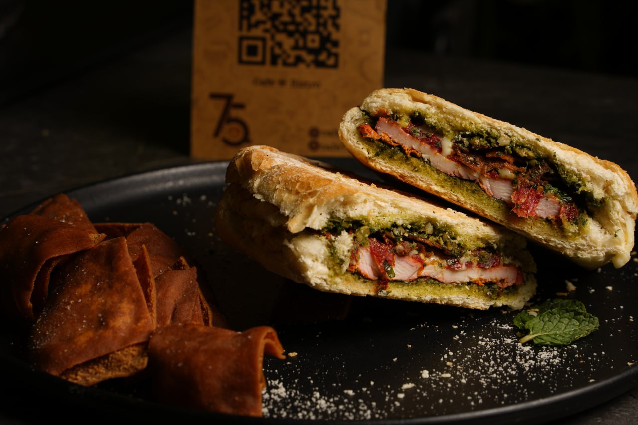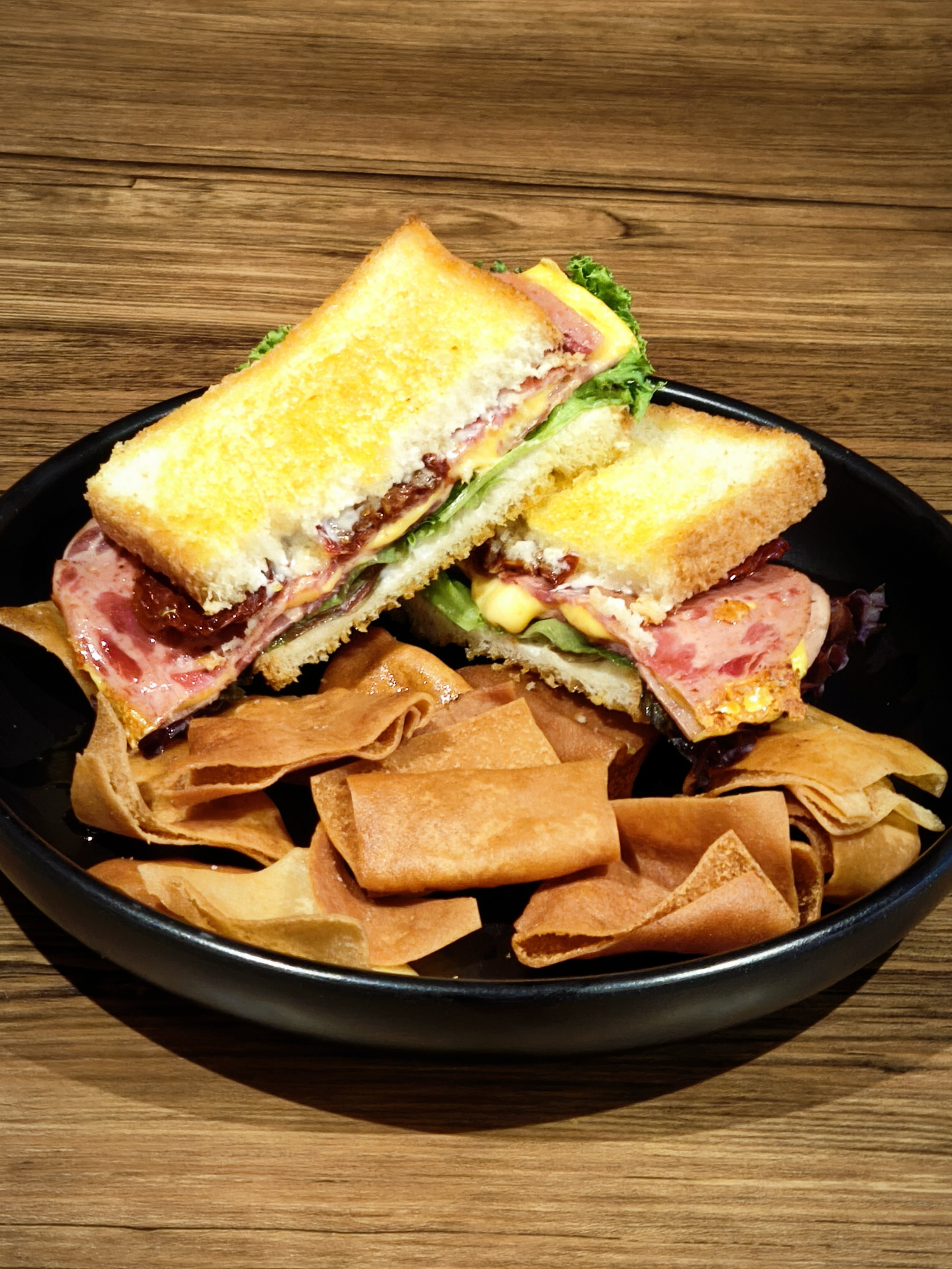 نون تست شده با کره به همراه ژامبون و پنیر گودا با سس مخصوص و کاهو فرانسه و گوجه خشک با دورچین پیتا
