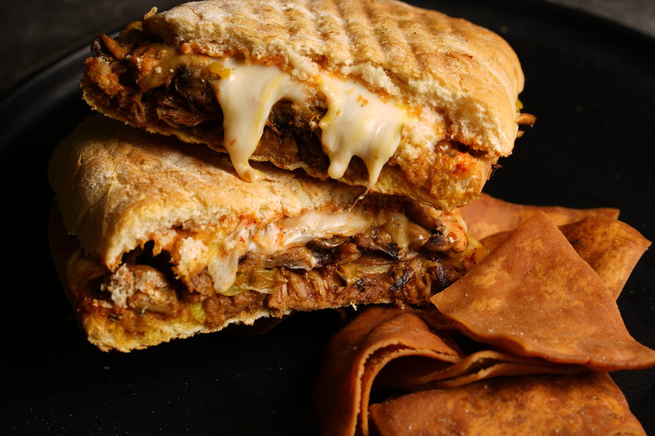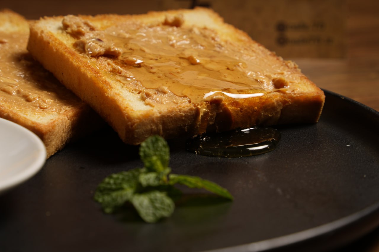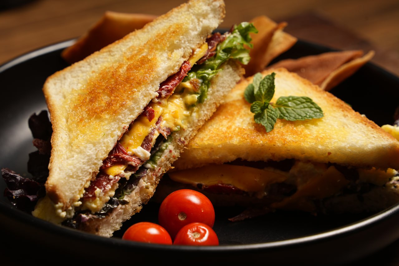 نون تست شده با کره به همراه بیکن گوساله و پنیر گودا و ریحون ایتالیایی با دورچین نان پیتا
