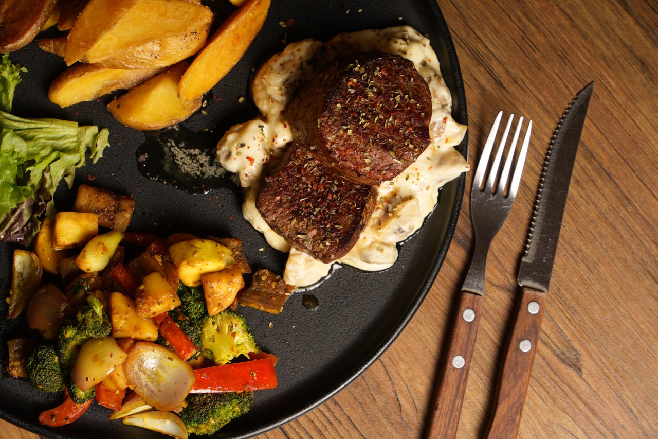 250 گرم گوشت راسته+ سس قارچ+سیب زمینی سرخ شده+ سبزیجات