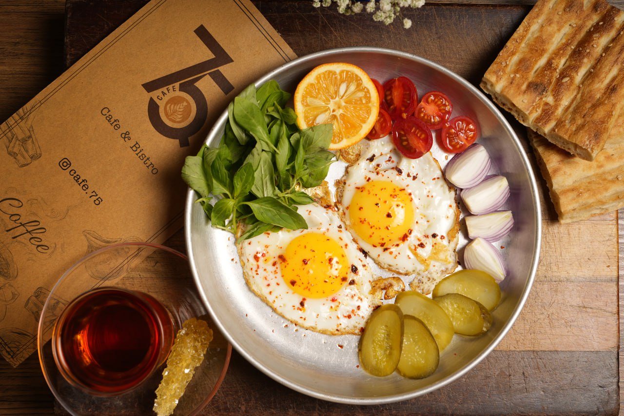 دو عدد تخم مرغ به همراه دورچین کامل و نان