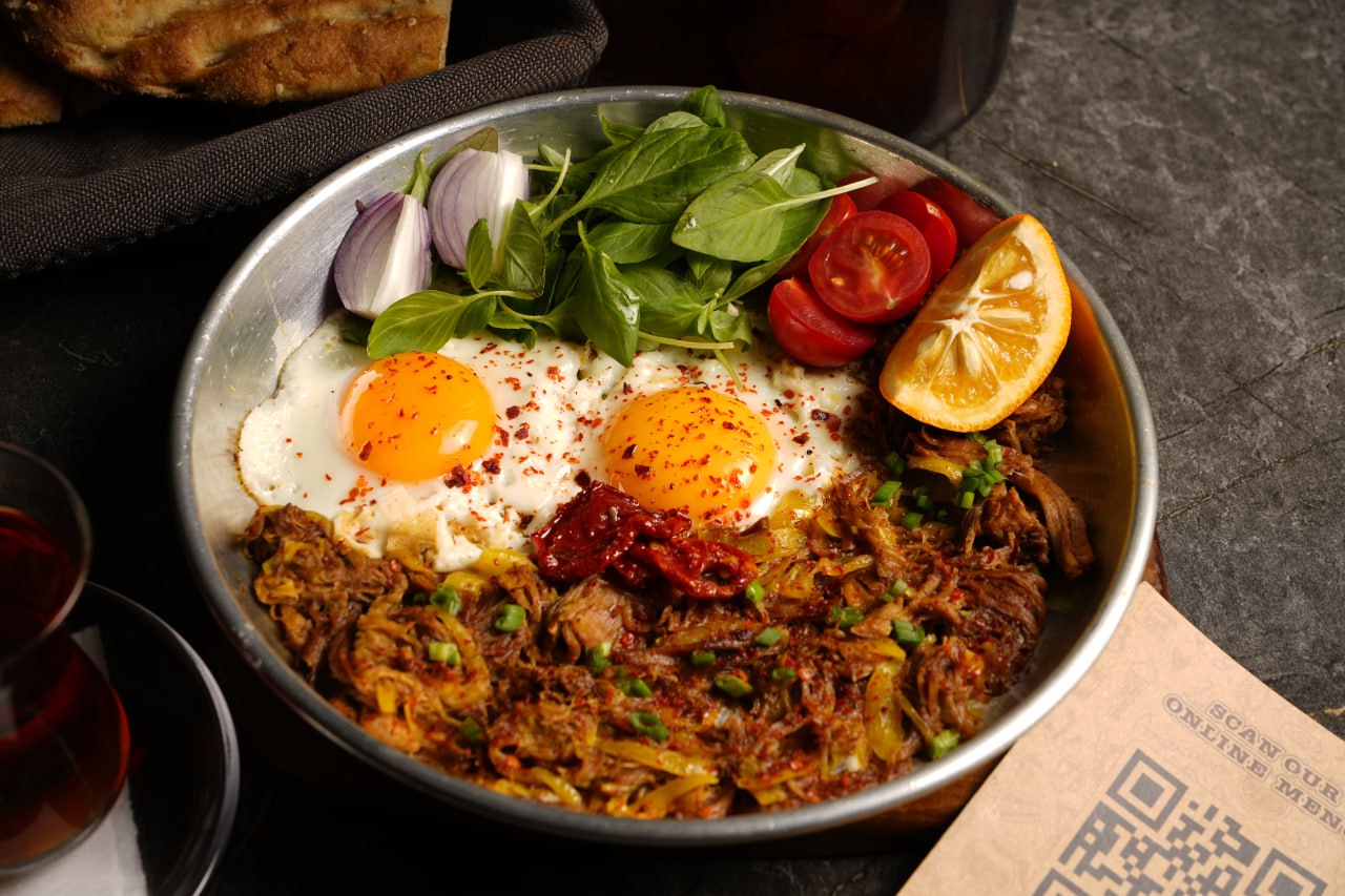 گوشت رست شده به همراه پیاز کاراملی و دو عدد نیمرو به همراه دورچین کامل