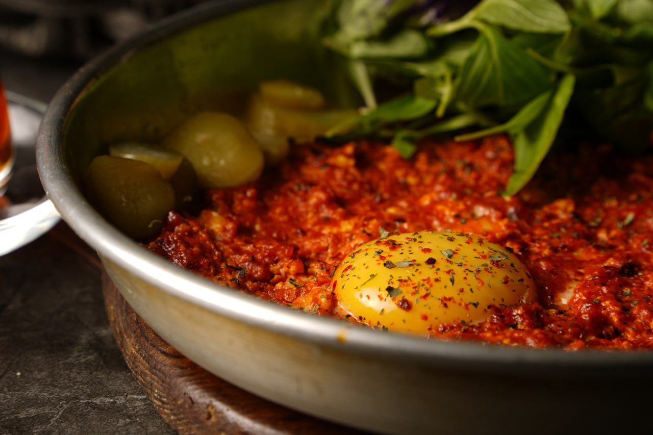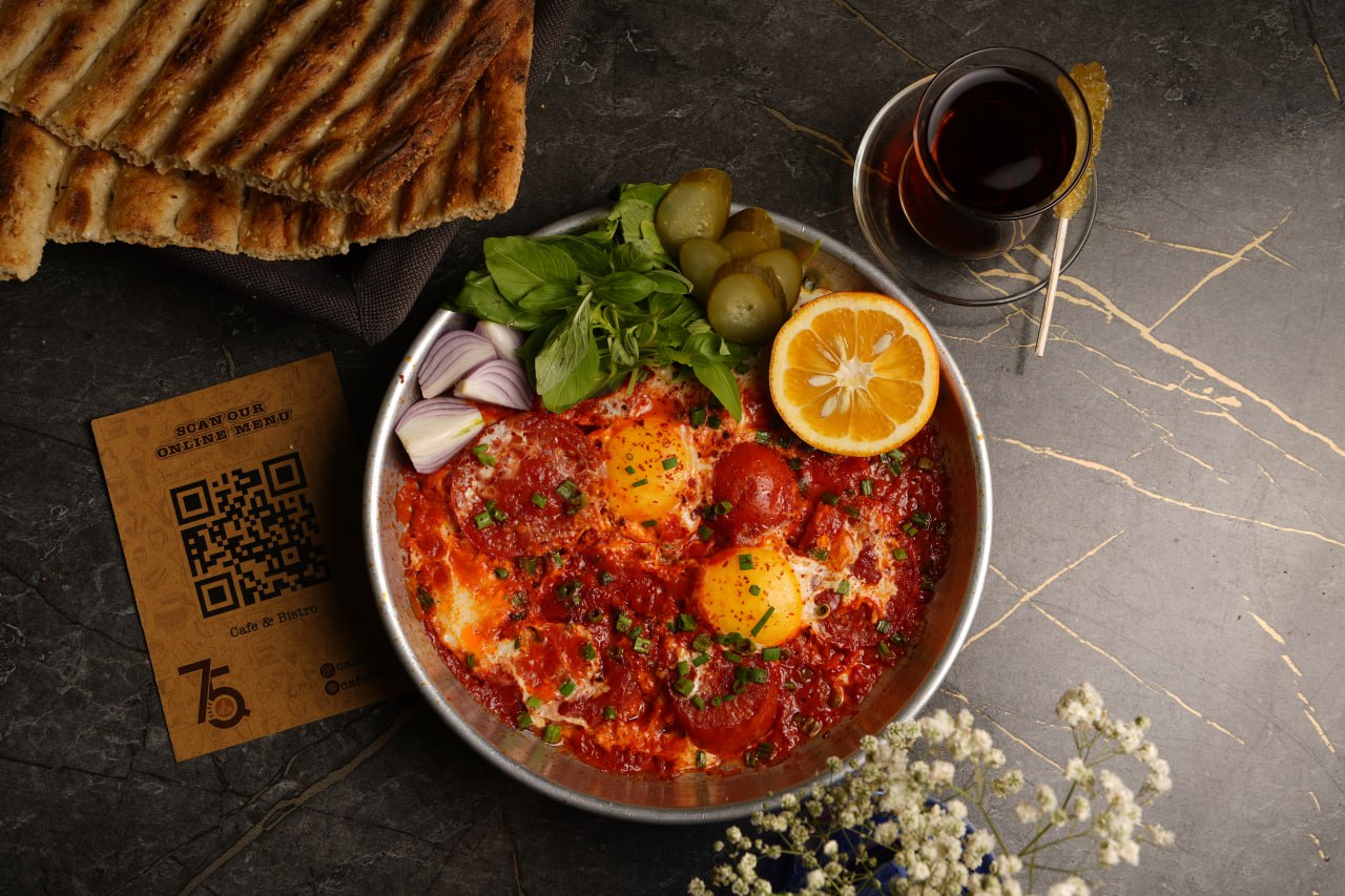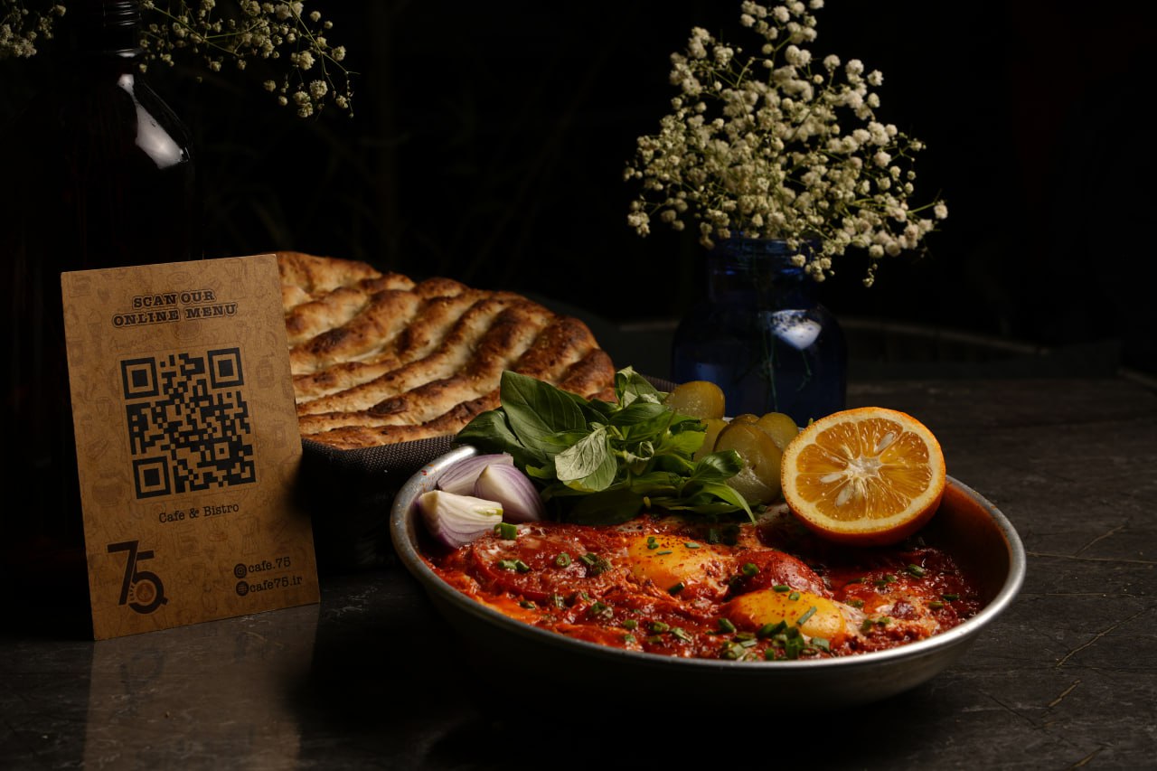 سه عدد تخم مرغ به همراه سس رب گوجه فرنگی و ادویه مخصوص و دورچین کامل