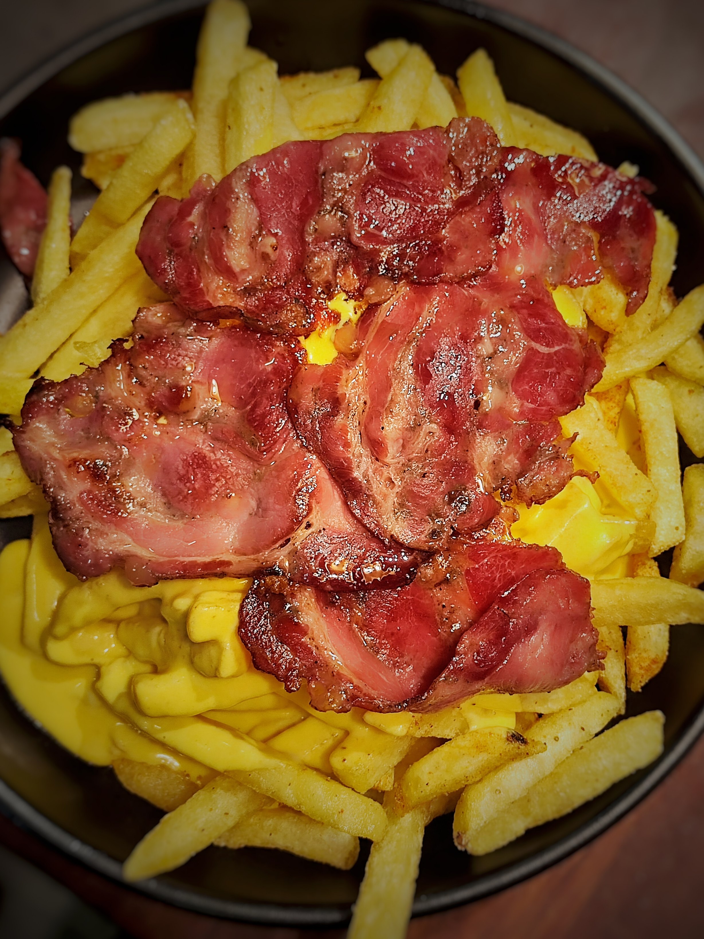 سیب زمینی سرخ شده به همراه سس میکس سه پنیر و بیکن گریل شده