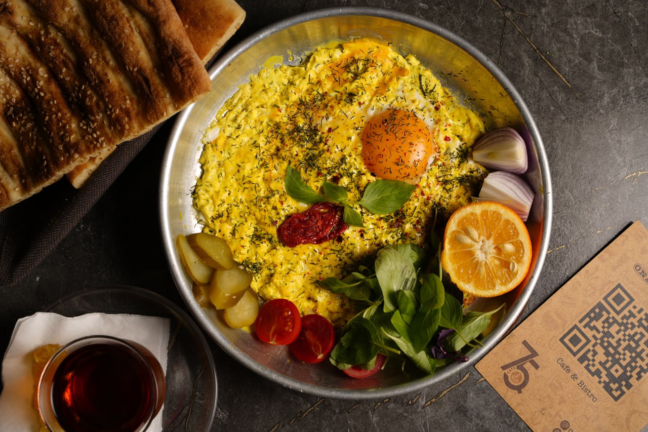 دوعدد تخم مرغ به همراه پنیر لبنه و شوید و سیر