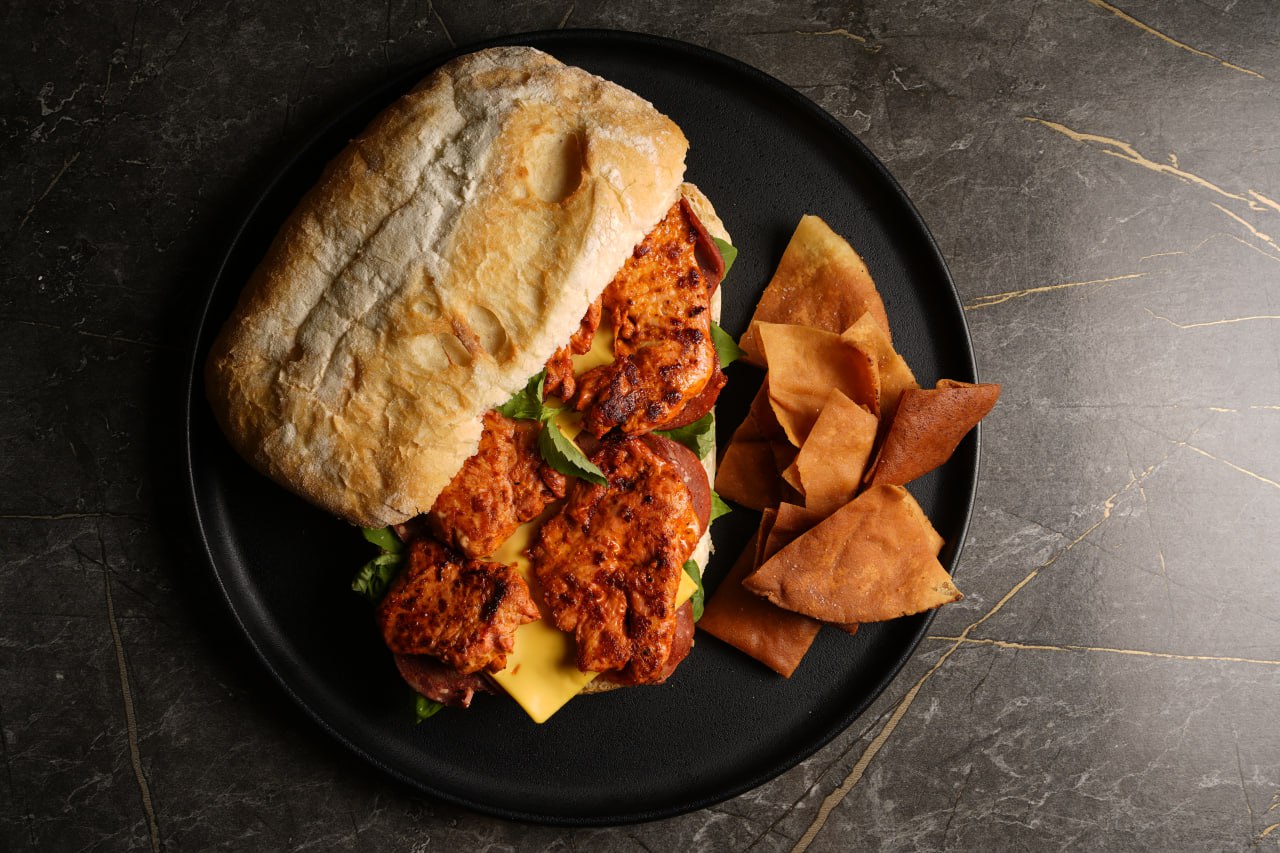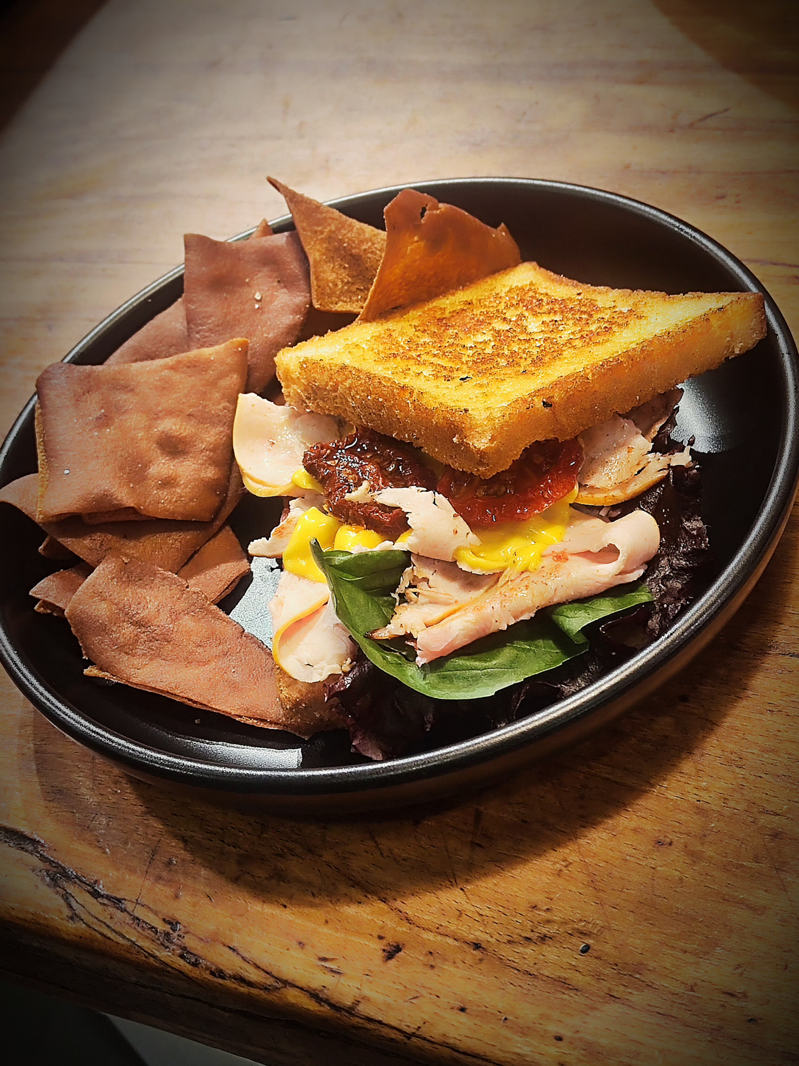 نان تست شده با کره به همراه بوقلمون گریل شده و پنیر خامه ای کاهو فرانسه و پنیر گودا به همراه دورچین نان پیتا