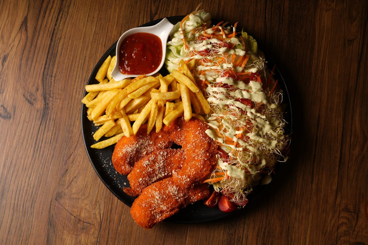 4 عدد فیله سوخاری+ ساید سالاد کاهو+سیب زمینی سرخ کرده و سس سوییت چیلی دست ساز