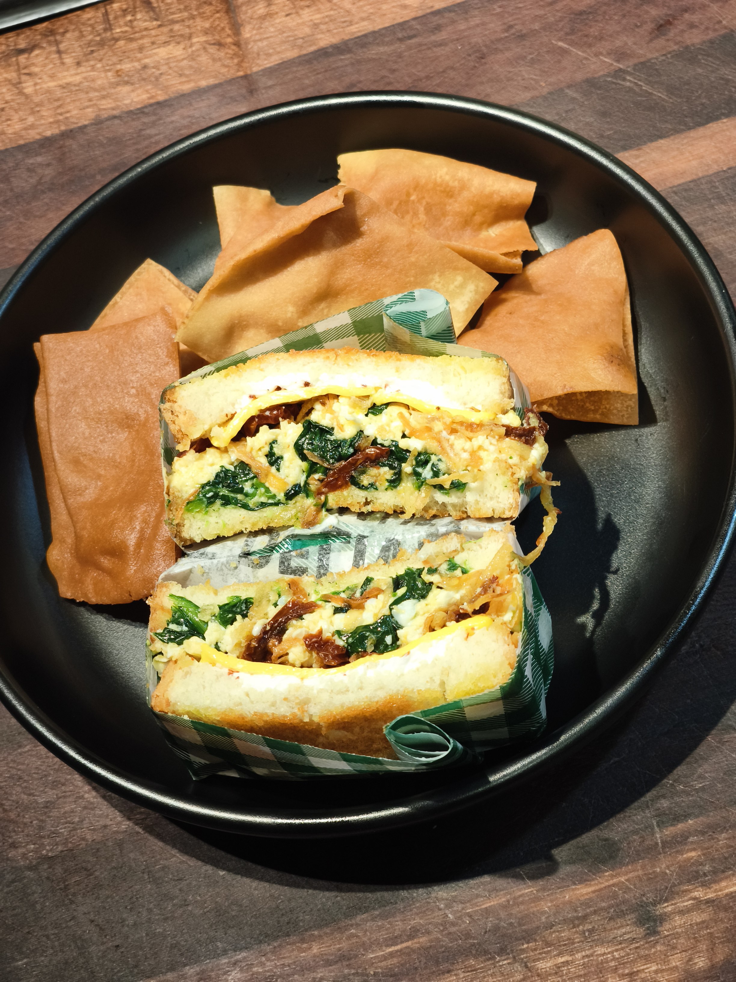 اسکرامبل تخم مرغ به همراه اسفناج و پیاز داغ و گوجه خشک و دیپ پنیر خامه ای